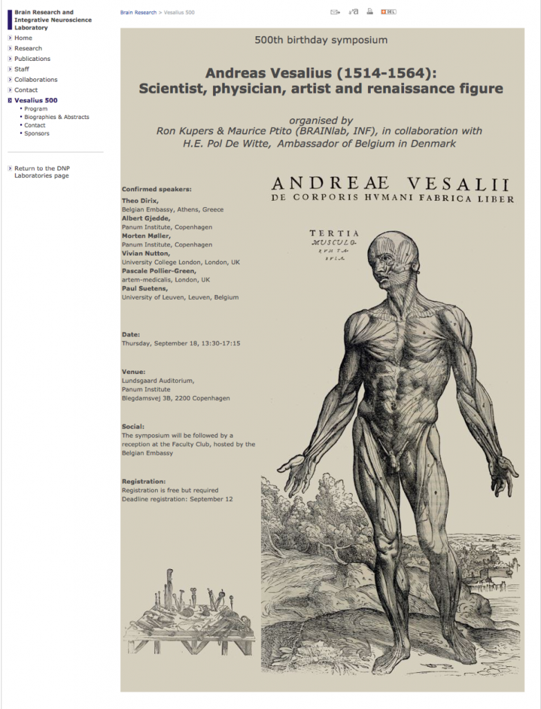 In the “Andreas Vesalius 500 Birthday Symposium” entitled “Anatomy, Art and the Body”, that took place in Copenhagen, at 18th of September 2014, numerous distinguished Vesalius scholars gave fascinating talks about the Life and Death of the great Flemish physician and artist, Andreas Vesalius.