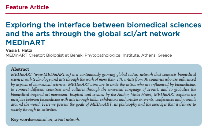 Under the title “Exploring the interface between biomedical sciences and the arts through the global sci/art network MΕDinART”, the article describes MEDinARΤ, its philosophy and the messages that it delivers to society through its activities.