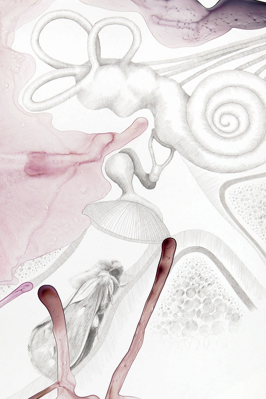 In this new body of work, Jovanovic continues to use chaotically splashed ink with meticulous cross-hatching in pencil. Influenced by phenomenology and medical ontology, and using scientific illustration as a point of departure, Jovanovic opens up the corporeal threshold to investigate what it means for something to be situated in the body, whether foreign or familiar.