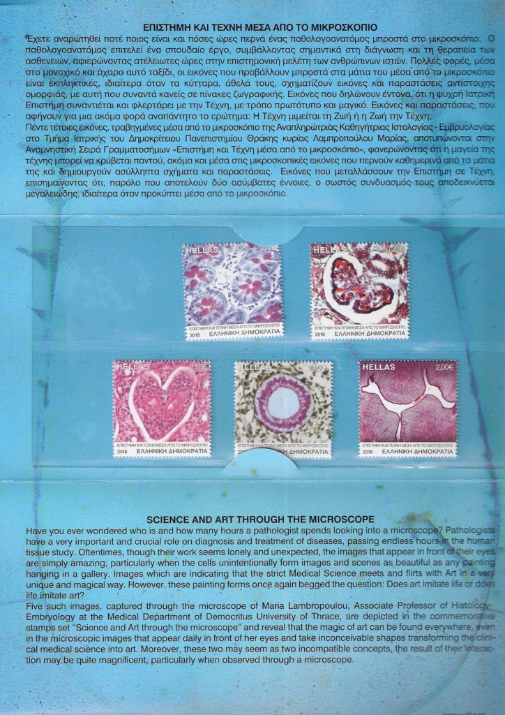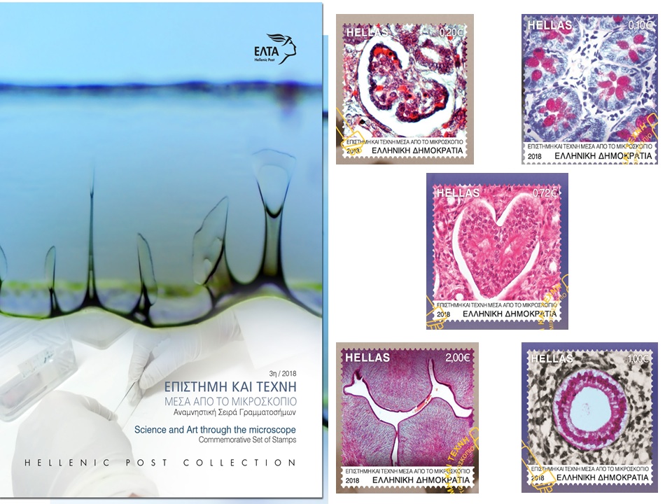 Five microscopic images, captured through the microscope of Maria Lambropoulou, are depicted in the commemorative stamps set “Science and Art through the Microscope”, of HELLENIC POST COLLECTION.
