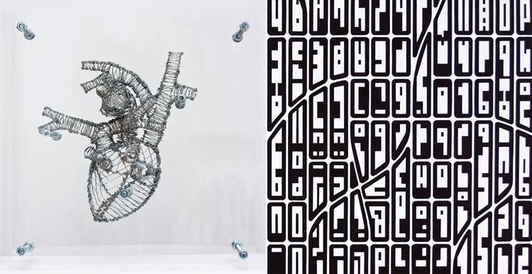 The exhibition ANATOMICAL ARCHITECTURES is the result of a personal inquiry on the relationship between the human body and architecture. Some twenty works produced by the artist between 2008 and 2013 have been selected to make up a set shown in a scenography halfway between the aesthetics of a museum and that of a research lab. Emulating an architectural approach, this body of work was developed along two lines of analysis. First, the artist sketches some components of the human body on wood panels with the help of drawings, painting and collages; then he materializes the subject in the guise of steel wire sculptures.