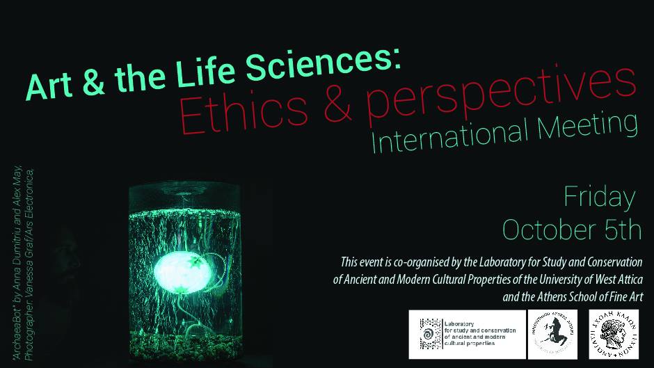 The Laboratory for Study and Conservation of Ancient and Modern Cultural Properties of the University of West Attica and the Athens School of Fine Art co-organise the International Meeting: “Art & the Life Sciences: Ethics & perspectives on Friday, 5 Οκτωβρίου 5th, 2018 at the Theater of the Athens School of Fine Art (256, Pireos str.). Participants in the meeting will be internationally acclaimed artists and curators who will exchange views with Greek academics with international research presence at the intersection of art and the life sciences.