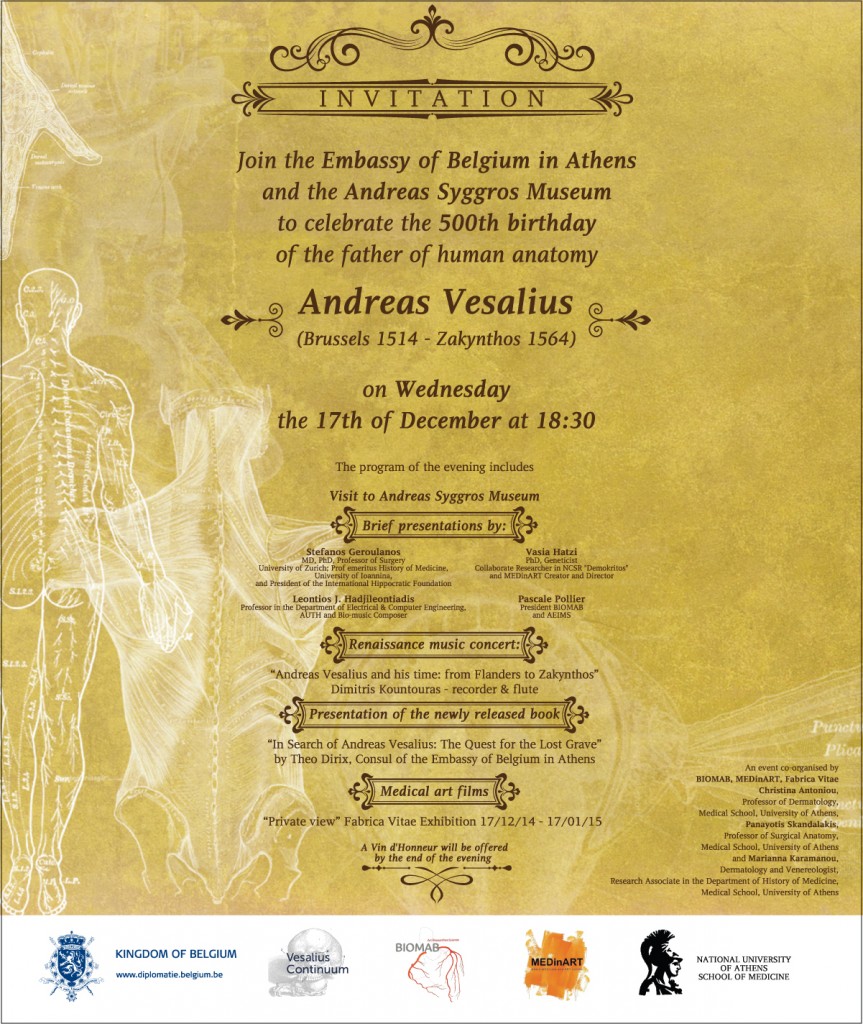 We are delighted to invite you all to celebrate with us the 500th Birthday of Andreas Vesalius -the legendary Flemish Physician and great Artist of the Renaissance- in an event organized by the Embassy of Belgium in Athens and Andreas Syggros Museum in collaboration with MEDinART, BIOMAB and FABRICA VITAE that will take place in Andreas Syggros Museum of Athens on Wednesday 17 December 2014 at 18:30.